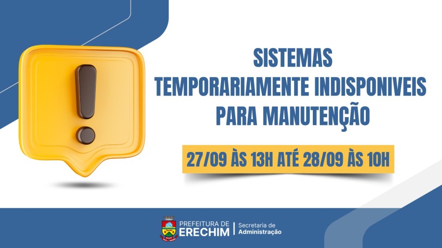 A Prefeitura de Erechim, por meio da Secretaria Municipal de Administração, informa que os Sistemas SAPI e os Serviços Online estarão temporariamente fora do ar neste final de semana.