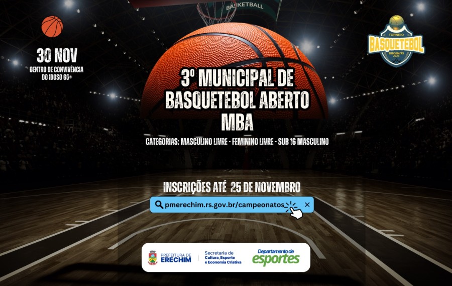 O basquete volta a ser destaque em Erechim com a realização do 3º Municipal de Basquetebol Aberto – MBA, no dia 30 de novembro, no Centro de Convivência do Idoso 60+. O evento deve reunir atletas de diferentes idades e promover um grande encontro esportivo na cidade.