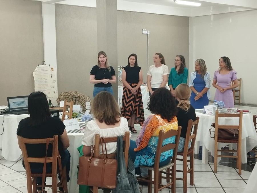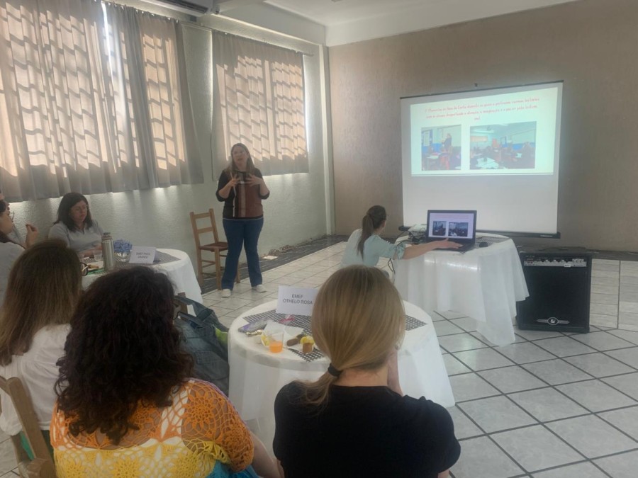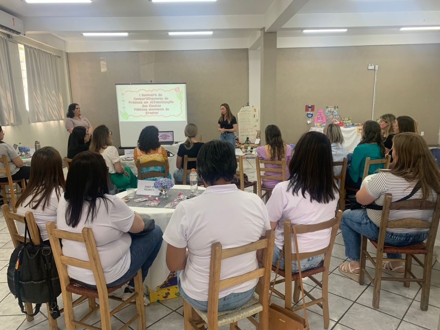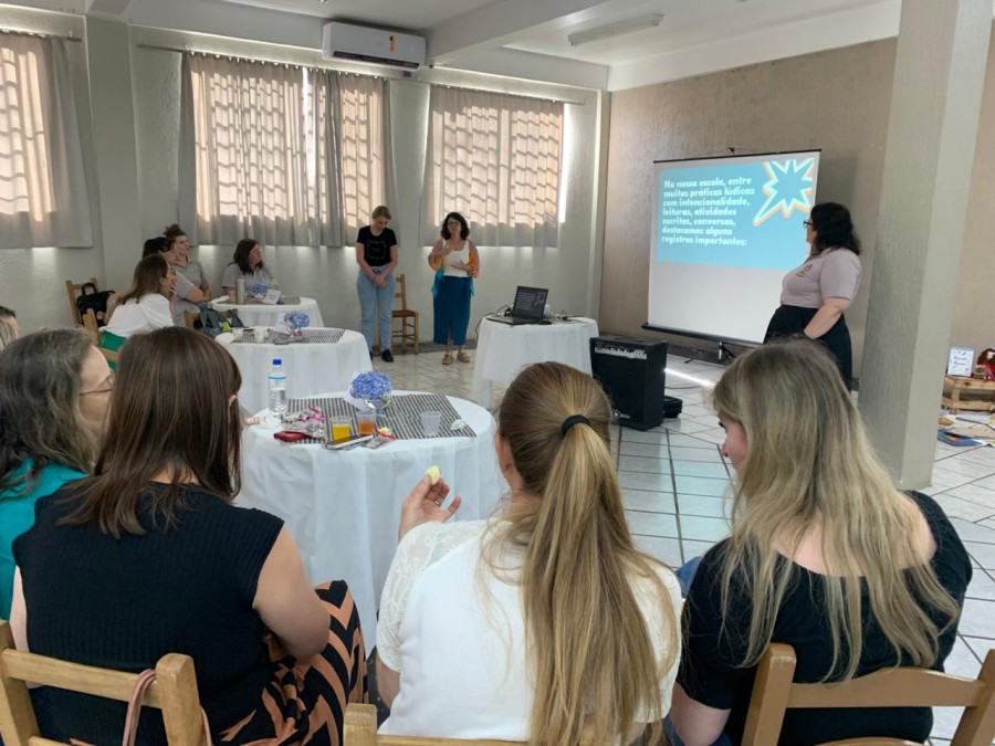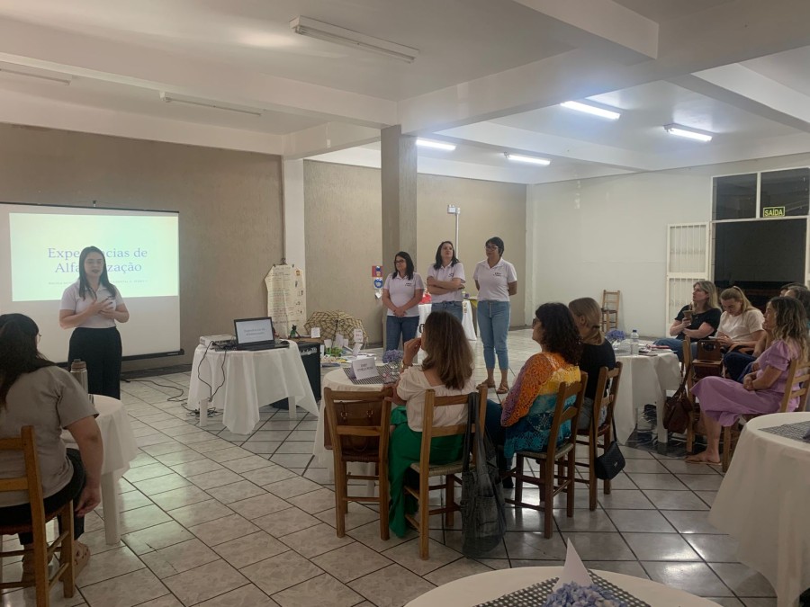 O encerramento do percurso formativo foi marcado pela realização do I Seminário de Compartilhamento de Práticas em Alfabetização das Escolas Públicas Municipais de Erechim, realizado nas dependências do SIME – Sindicato dos Municipários. O evento constituiu-se em um espaço de valorização das experiências pedagógicas desenvolvidas ao longo do ano, permitindo que cada escola apresentasse suas práticas exitosas em alfabetização e promovendo a troca de saberes entre os profissionais da rede.