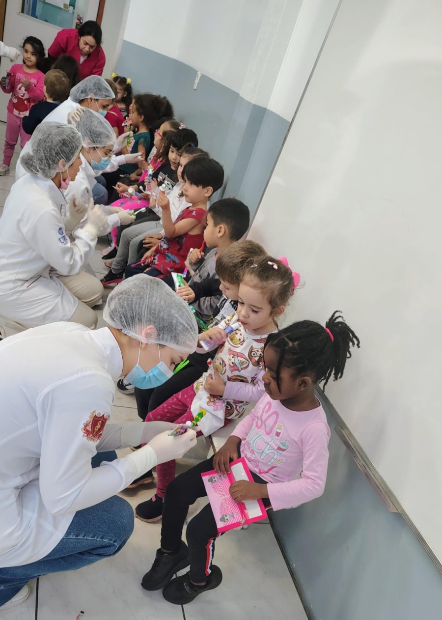Durante a ação, as crianças participaram de orientações sobre escovação dental e educação em saúde bucal, de forma lúdica e interativa, com o apoio de acadêmicos e profissionais voluntários da área de Odontologia. Ao final, os estudantes receberam kits de higiene, contendo escova e creme dental, reforçando a prática da escovação correta também em casa.