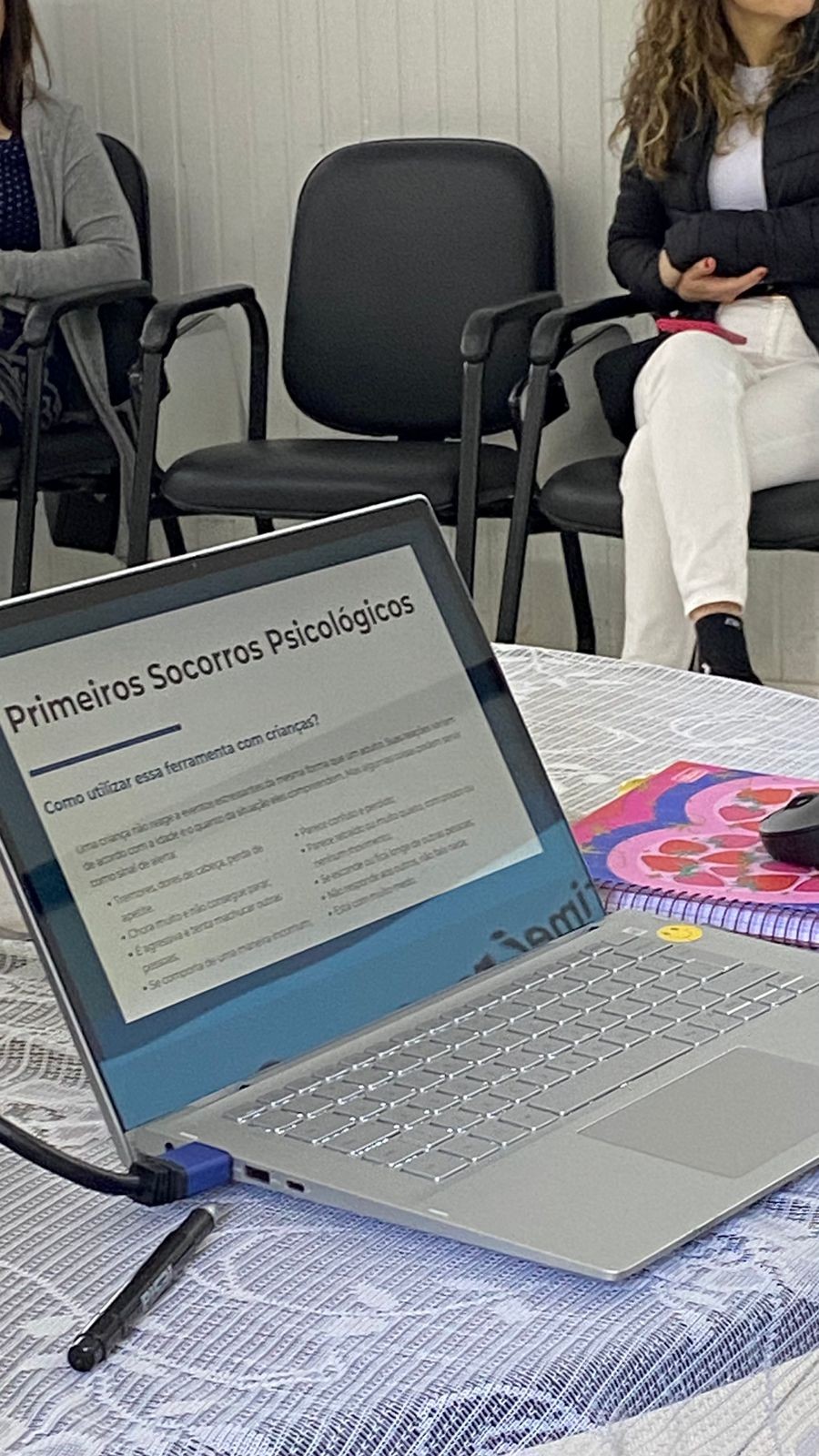 O grupo apresentou uma fala sobre Primeiros Socorros Psicológicos, voltada às professoras de Apoio ao Processo de Ensino Aprendizagem, do Sistema Municipal de Ensino, com o objetivo de promover a troca de experiências e o aperfeiçoamento das práticas de acolhimento emocional no ambiente escolar.