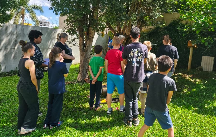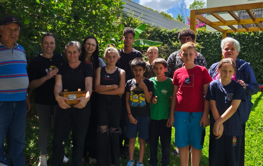 As crianças e adolescentes atendidos pelo Centro de Atenção Psicossocial Infantojuvenil (CAPSi), acompanhados por seus familiares e pela oficineira Valdete Klein, viveram uma tarde especial na quarta-feira (19). O grupo participou da divisão das colmeias de abelhas-sem-ferrão no meliponário, em uma atividade que combinou técnica, descoberta e encantamento.