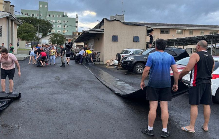 Mesmo com o quartel duramente atingido, policiais do 13º BPM prestaram atendimento imediato, reforçaram a segurança, auxiliaram na entrega de lonas e telhados e apoiaram ações sociais nos bairros.