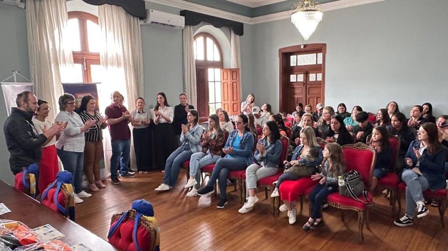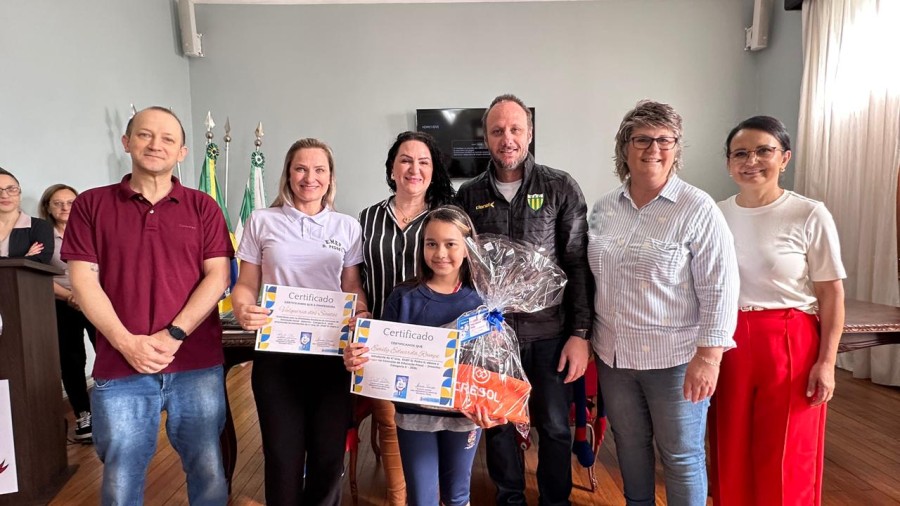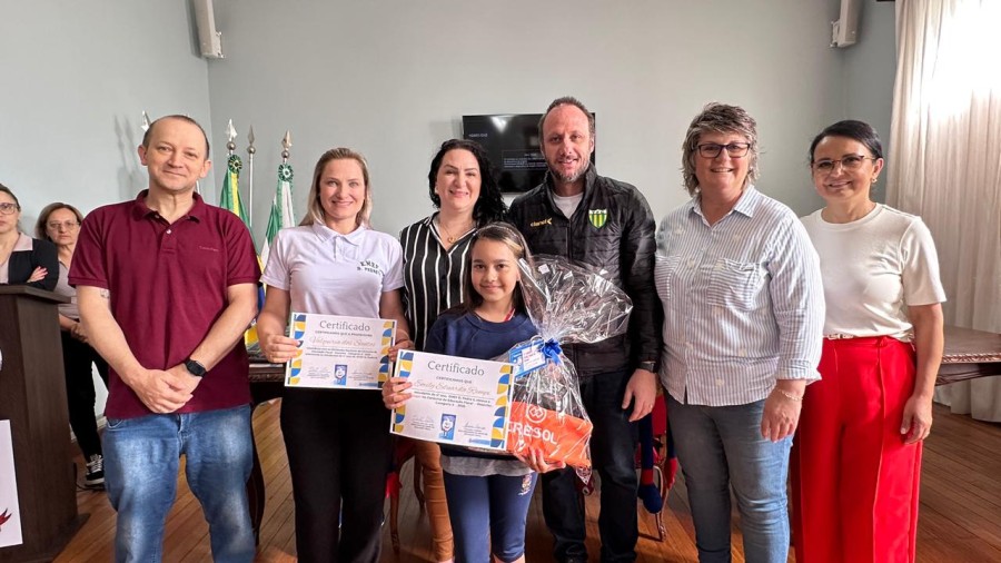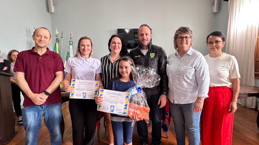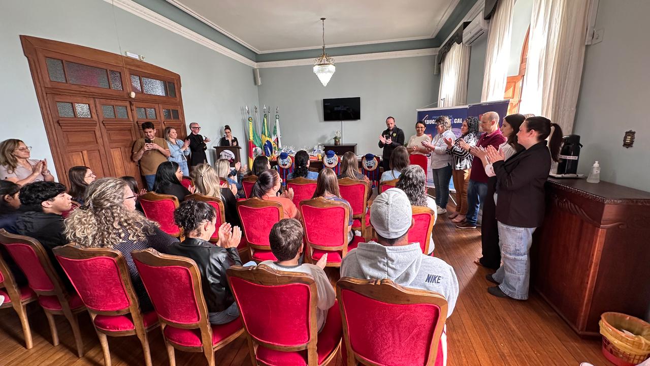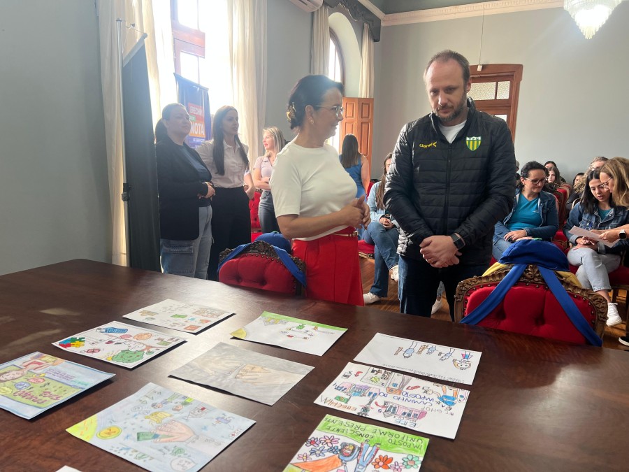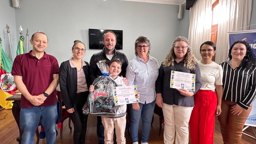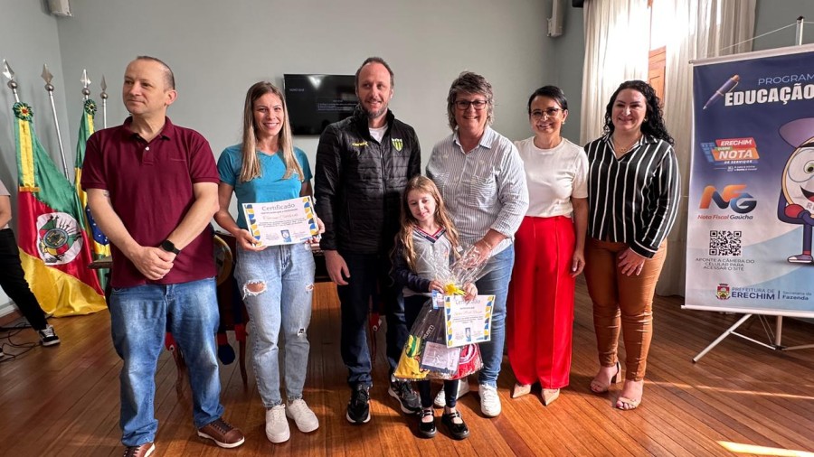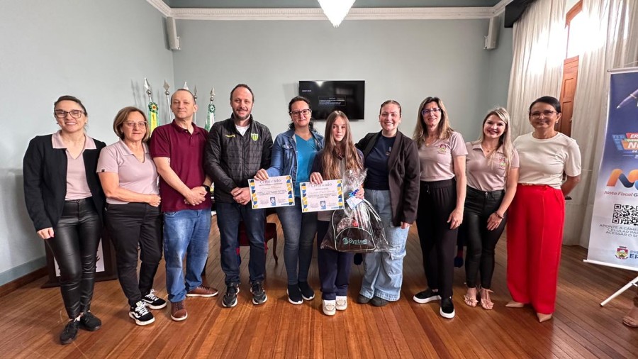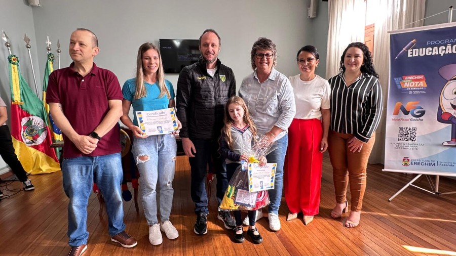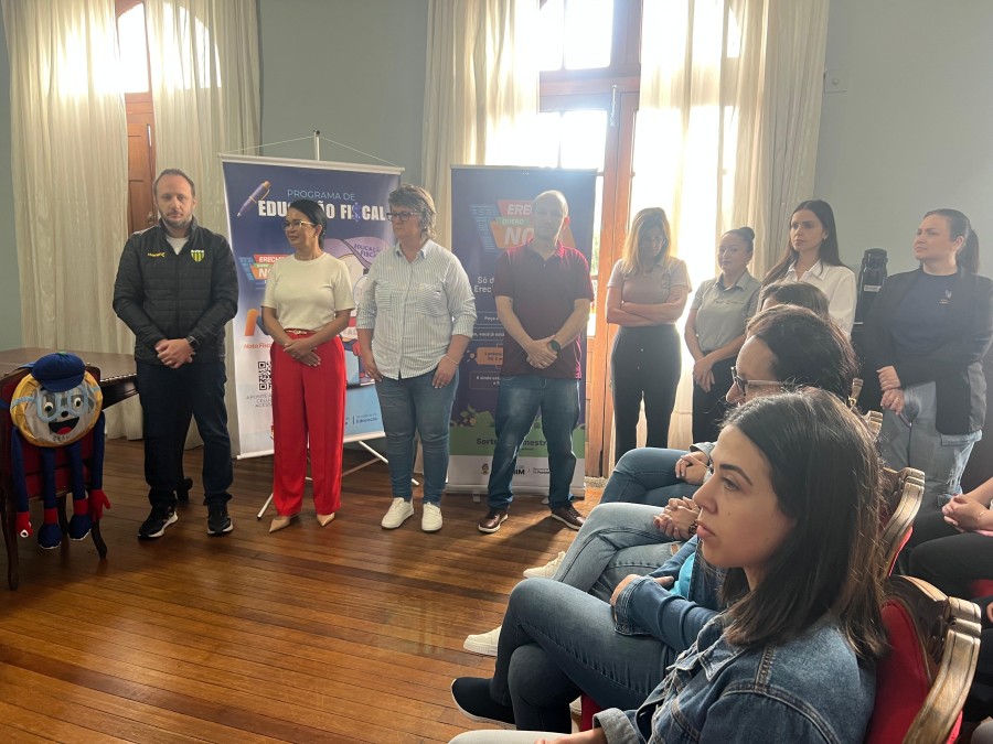 O momento foi realizado nesta quinta-feira (11), no Salão Nobre da Prefeitura e contou com a presença do presidente da Comissão de Educação Fiscal do Município de Erechim, Itamar Luis Dall Alba, da secretária da Fazenda, Ana Oliveira, da secretária de Educação, Verenice Lipsch, da secretária de Administração, Aline da Costa e do vice-prefeito de Erechim, Flávio Tirello, além de professores, estudantes e servidores das secretarias envolvidas no projeto.