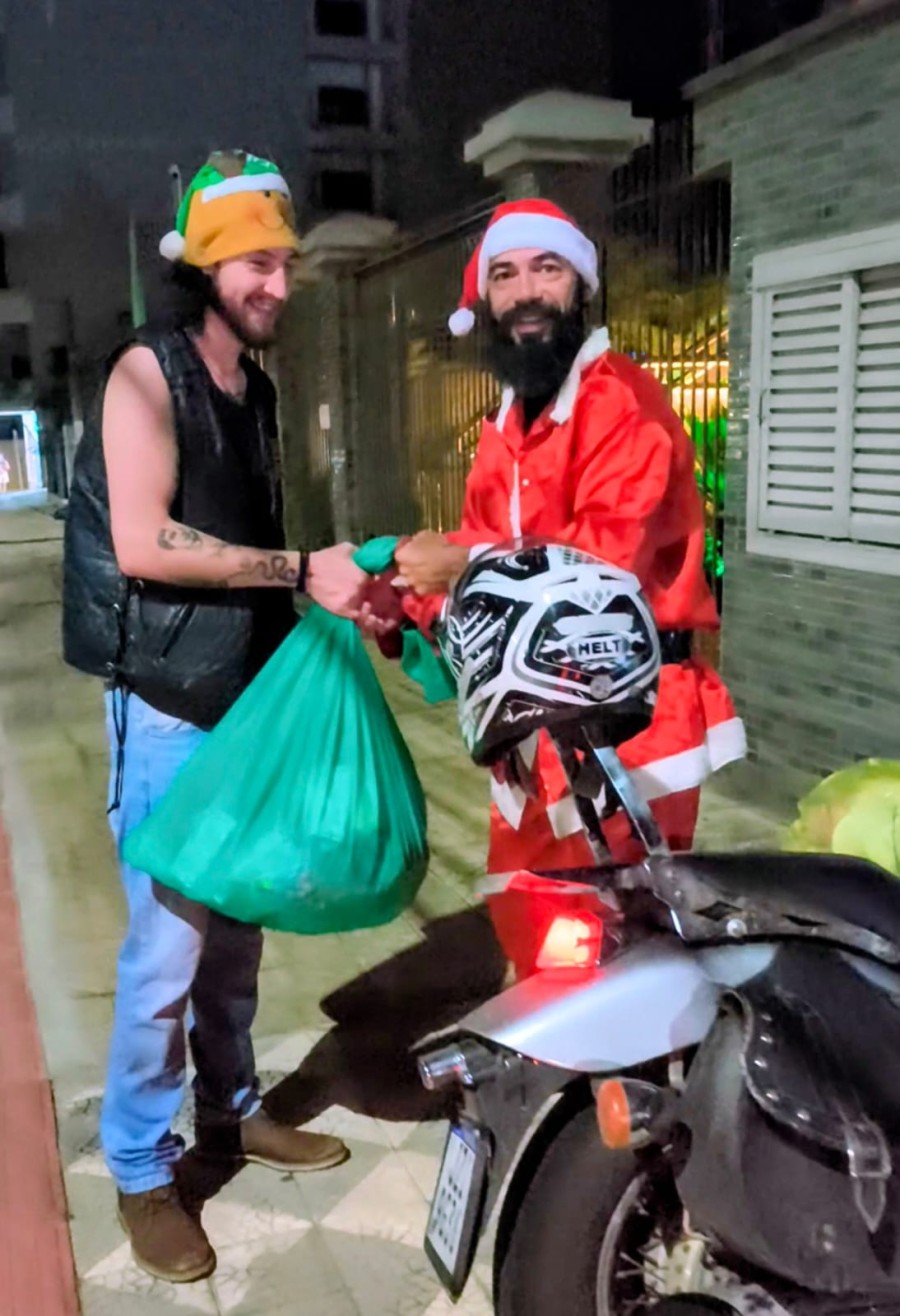 Um dos momentos mais aguardados da noite foi a chegada do Papai Noel, que surpreendeu ao aparecer em uma motocicleta Harley-Davidson, acompanhado pelos ajudantes do grupo Mutantes. O barulho provocou sustos, risadas e muita curiosidade entre as crianças, tornando a cena ainda mais marcante.