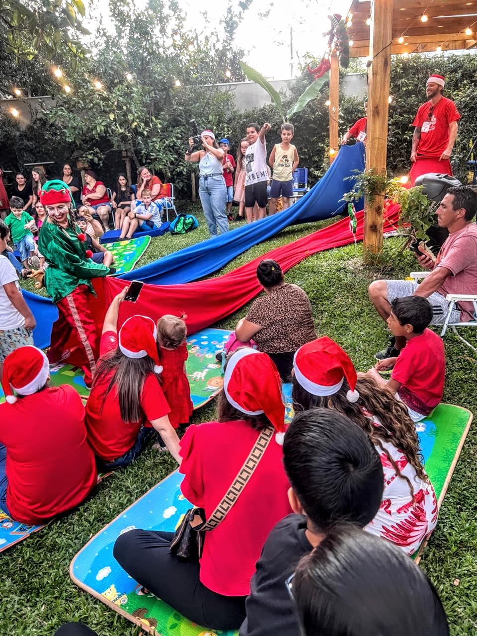 A ambientação foi preparada com atenção a cada detalhe, buscando estimular a imaginação e criar memórias afetivas. O trabalho contou com o apoio voluntário do grupo de mulheres Colos que Curam e com a parceria da Secretaria Municipal de Cultura, Esporte e Economia Criativa. Desde a chegada das famílias, o clima era de encantamento: crianças corriam pelo pátio, observavam as luzes e registravam o momento em fotos antes mesmo do início da programação.