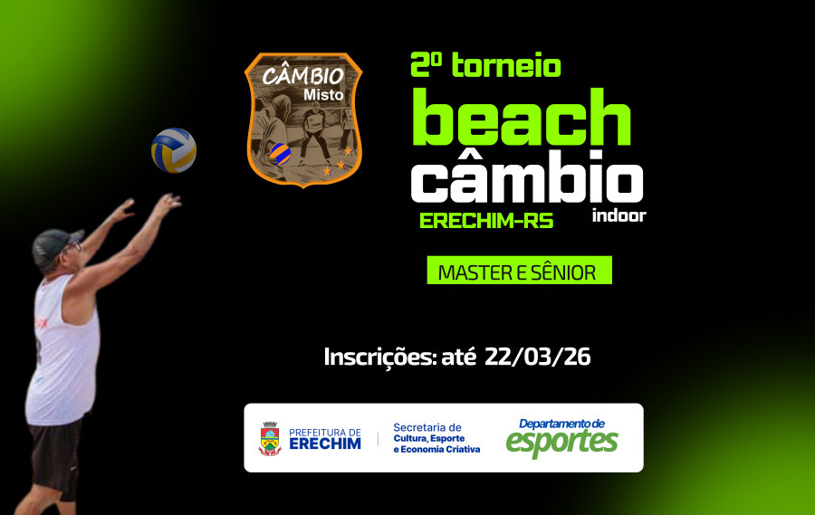 A Prefeitura de Erechim, por meio da Secretaria Municipal de Cultura, Esporte e Economia Criativa e do Departamento de Esportes, promove no dia 28 de março de 2026 o 2º Torneio Beach Câmbio Indoor, que será realizado na Arena Set Point, a partir das 8h.