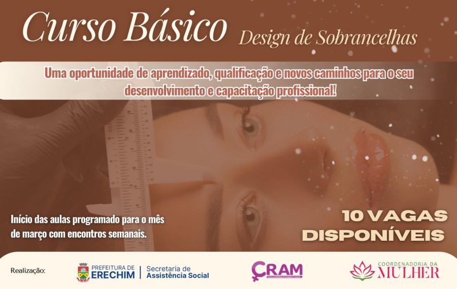 A Prefeitura de Erechim, por meio da Secretaria de Assistência Social, do Centro de Referência em Atendimento à Mulher (CRAM) e da Coordenadoria da Mulher, promove durante o mês de março um curso básico de design de sobrancelhas, voltado à qualificação e ao desenvolvimento profissional.