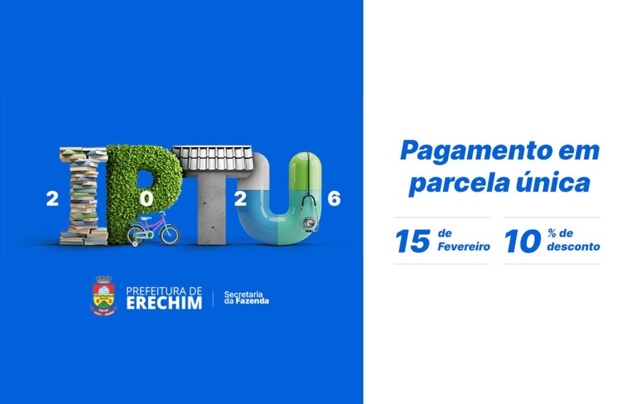 A Prefeitura de Erechim, por meio da Secretaria Municipal da Fazenda, informa que o IPTU Digital 2026 já está disponível para os contribuintes. A principal vantagem é o desconto de 10% para quem optar pelo pagamento em parcela única até o dia 15 de fevereiro, o maior abatimento oferecido neste exercício.