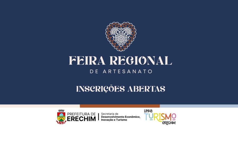 A Prefeitura de Erechim, por meio da Secretaria Municipal de Desenvolvimento Econômico, Inovação e Turismo, promove nos dias 13, 14 e 15 de março de 2026, no Parque da ACCIE, a 1ª Feira Regional de Artesanato do Norte do Estado do Rio Grande do Sul. Atualmente, são três Chamamentos Públicos para se inscrever e integrar o evento.