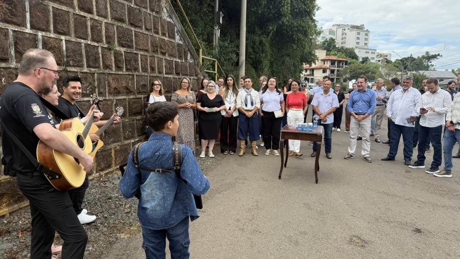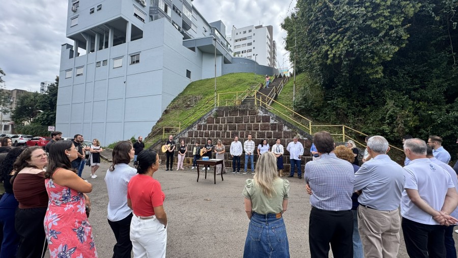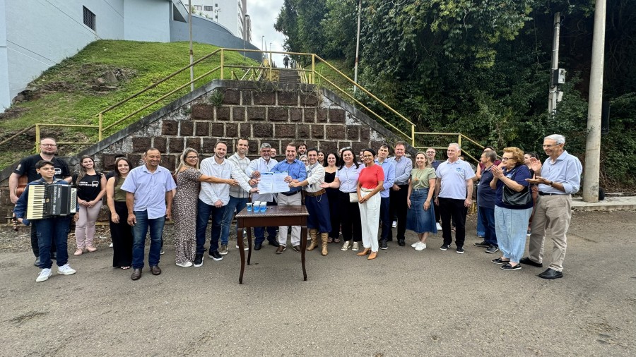 Na manhã desta segunda-feira (23), a Prefeitura de Erechim realizou a assinatura do contrato para a requalificação da Escadaria José Bonifácio Pereira, localizada na Avenida Salgado Filho. A cerimônia aconteceu no próprio local, simbolizando o início de uma nova fase para um dos espaços mais tradicionais da cidade, inaugurado em 1973 e responsável por ligar a área central do município. Estiveram presentes o prefeito Paulo Polis; o vice-prefeito Flávio Tirello; representando a Câmara de Vereadores, vereadora Clarice Moraes; o secretário de Desenvolvimento Econômico, Inovação e Turismo, Emerson Schelski; a empresária do grupo ‘Os Monarcas’ e presidente do Instituto Cultural Bota Amarela (ICBA), Tatiana Santin; entre outras autoridades, convidados e imprensa.