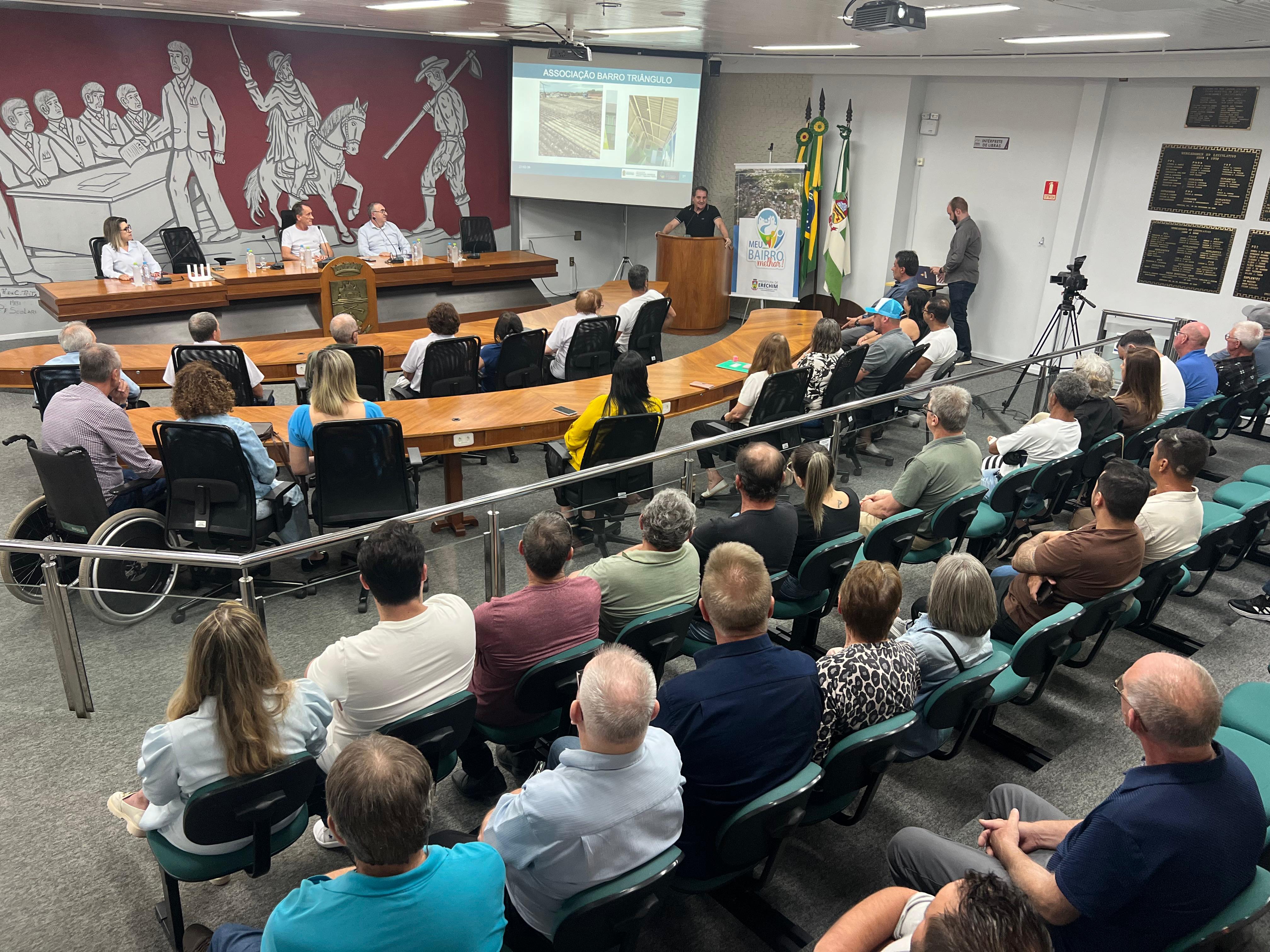 A Prefeitura de Erechim, por meio do Programa Meu Bairro Melhor, da Secretaria Municipal de Planejamento, Mobilidade Urbana e Segurança Pública, realizou nesta segunda-feira (23), na Câmara de Vereadores ato de assinatura dos contratos para as obras de recuperação dos telhados de 25 Associações Comunitárias e Capelas Mortuárias atingidas pela tempestade de granizo registrada em 23 de novembro de 2025.