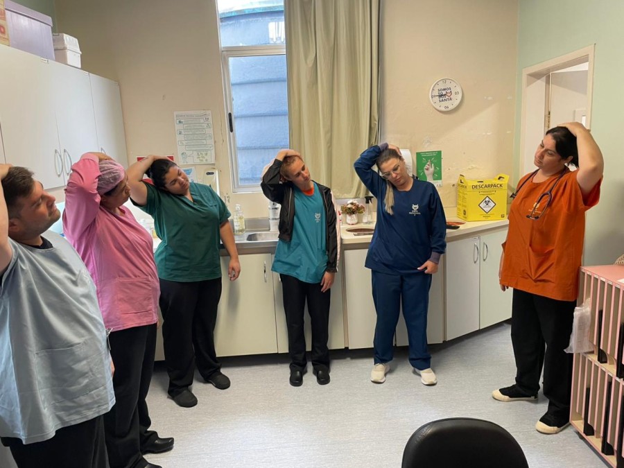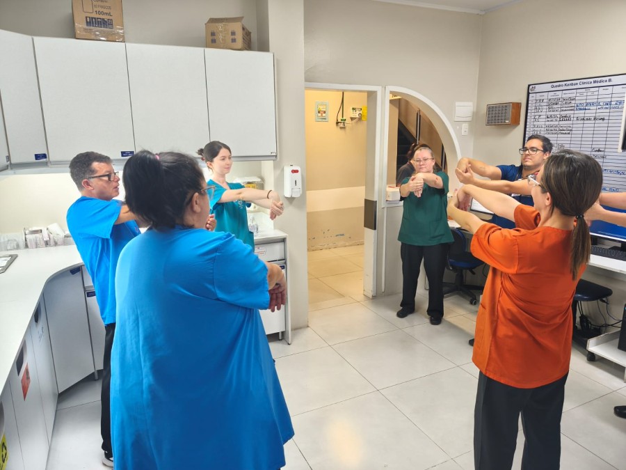 Durante a ação, os profissionais percorreram diversos setores do hospital realizando momentos de ginástica laboral com os colaboradores, levando orientações sobre postura, alongamento e cuidados no dia a dia. “Se cada profissional se comprometer a tirar dois minutos do seu dia para realizar um alongamento simples, isso já evitaria em grande parte a incidência deste tipo de lesão”, frisa Wellida.