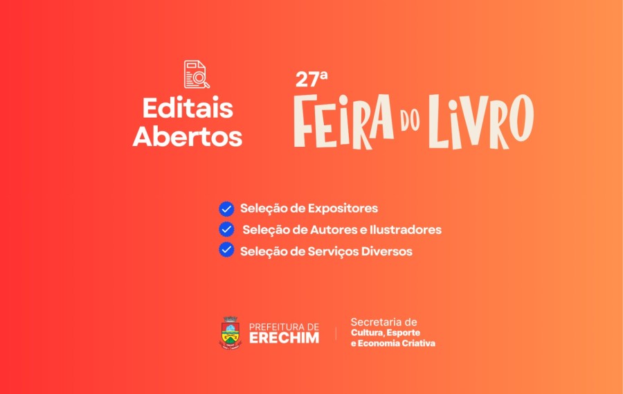 A organização da 27ª Feira do Livro de Erechim já iniciou os preparativos para mais uma edição deste grande evento. Para compor a programação e a estrutura da feira, a Secretaria Municipal de Cultura, Esporte e Economia Criativa abriu três editais públicos destinados à seleção de participantes e prestadores de serviços.