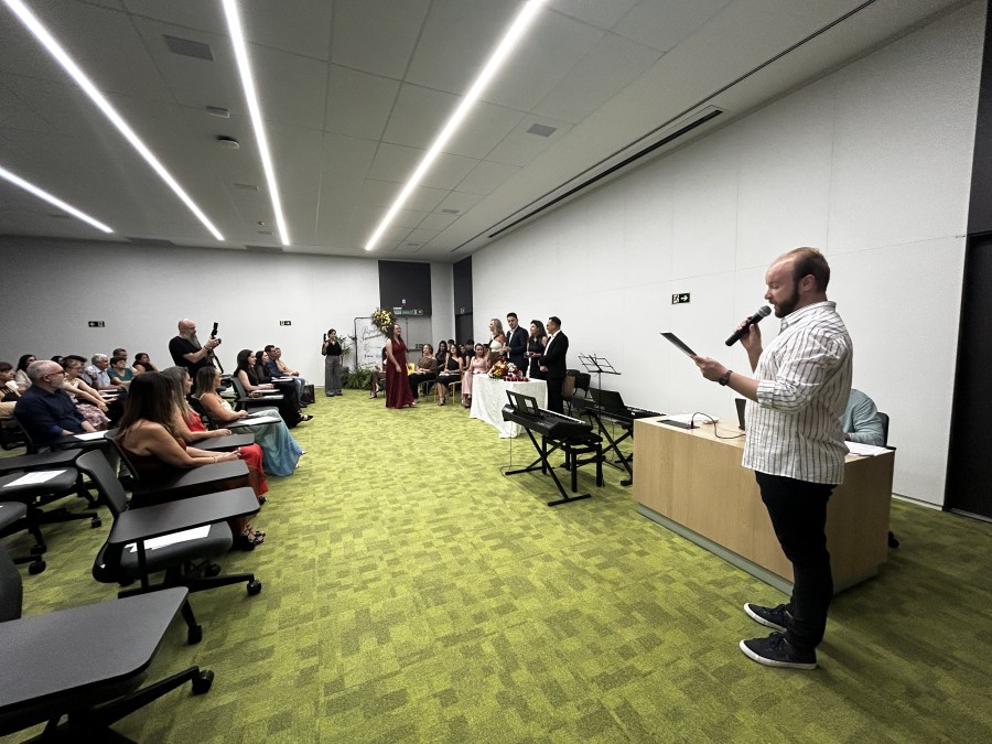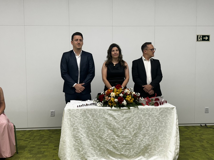 Após a composição da mesa de honra, a cerimônia seguiu com a entrada dos 12 formandos, acompanhados pela paraninfa da turma, a professora Jacqueline Mendes, e pelos professores homenageados.