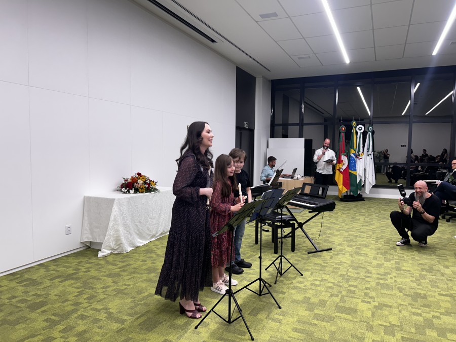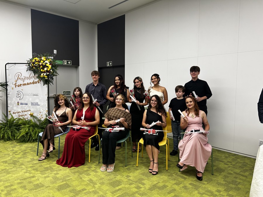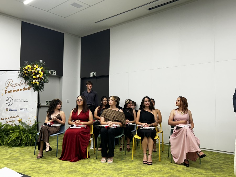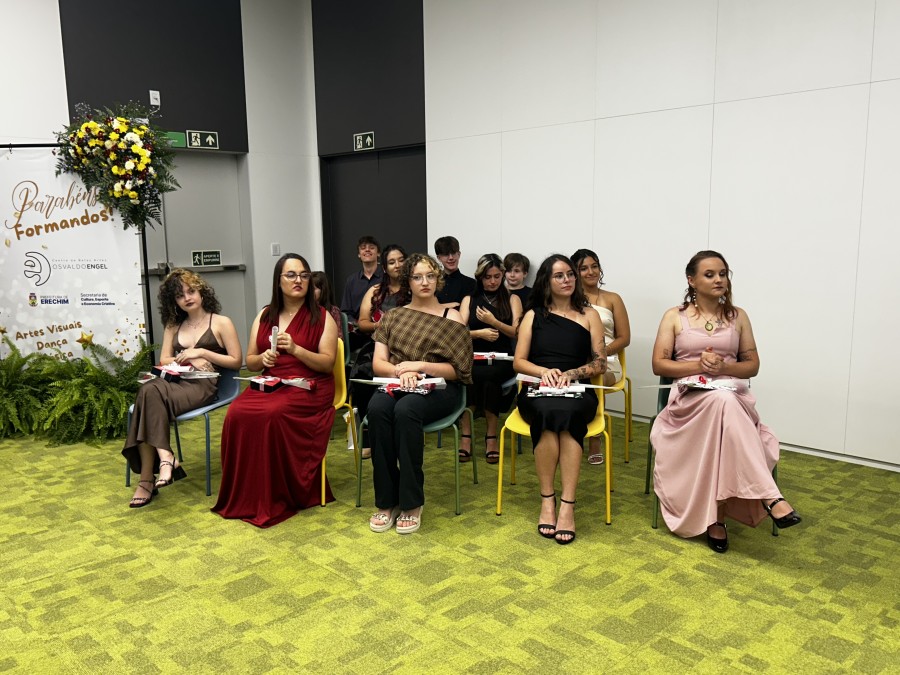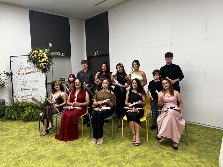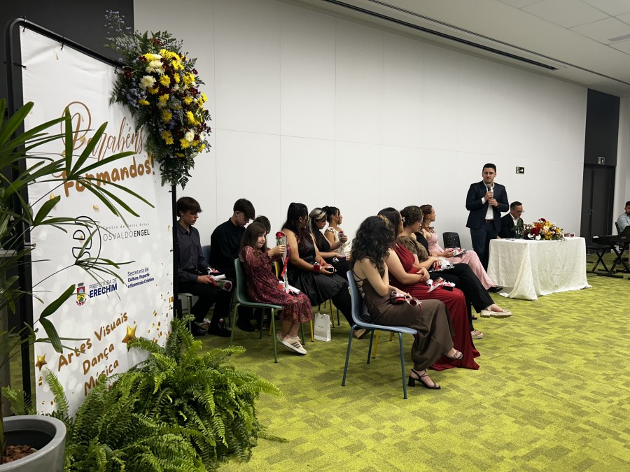 Promovido pela Prefeitura de Erechim, por meio da Secretaria Municipal de Cultura, Esporte e Economia Criativa, o evento marcou a entrega dos certificados aos formandos de 2025, que concluíram sua formação nas áreas de artes visuais, música e dança.