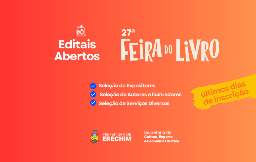 A Prefeitura de Erechim, por meio da Secretaria Municipal de Cultura, Esporte e Economia Criativa, reforça que estão chegando ao fim os prazos para inscrições nos editais da 27ª Feira do Livro. Os chamamentos públicos são voltados à seleção de expositores, autores, ilustradores e prestadores de serviços interessados em integrar um dos principais eventos culturais do município.